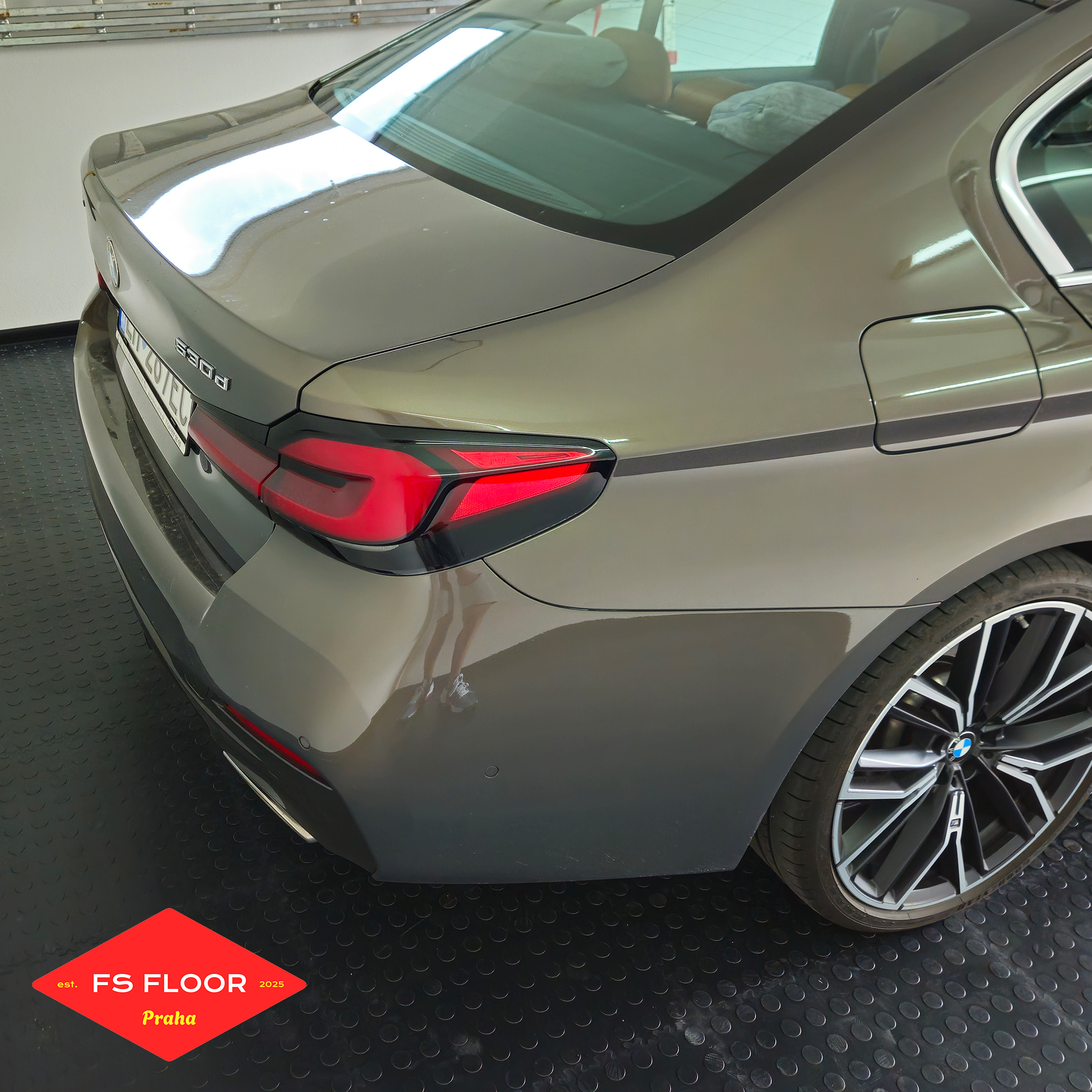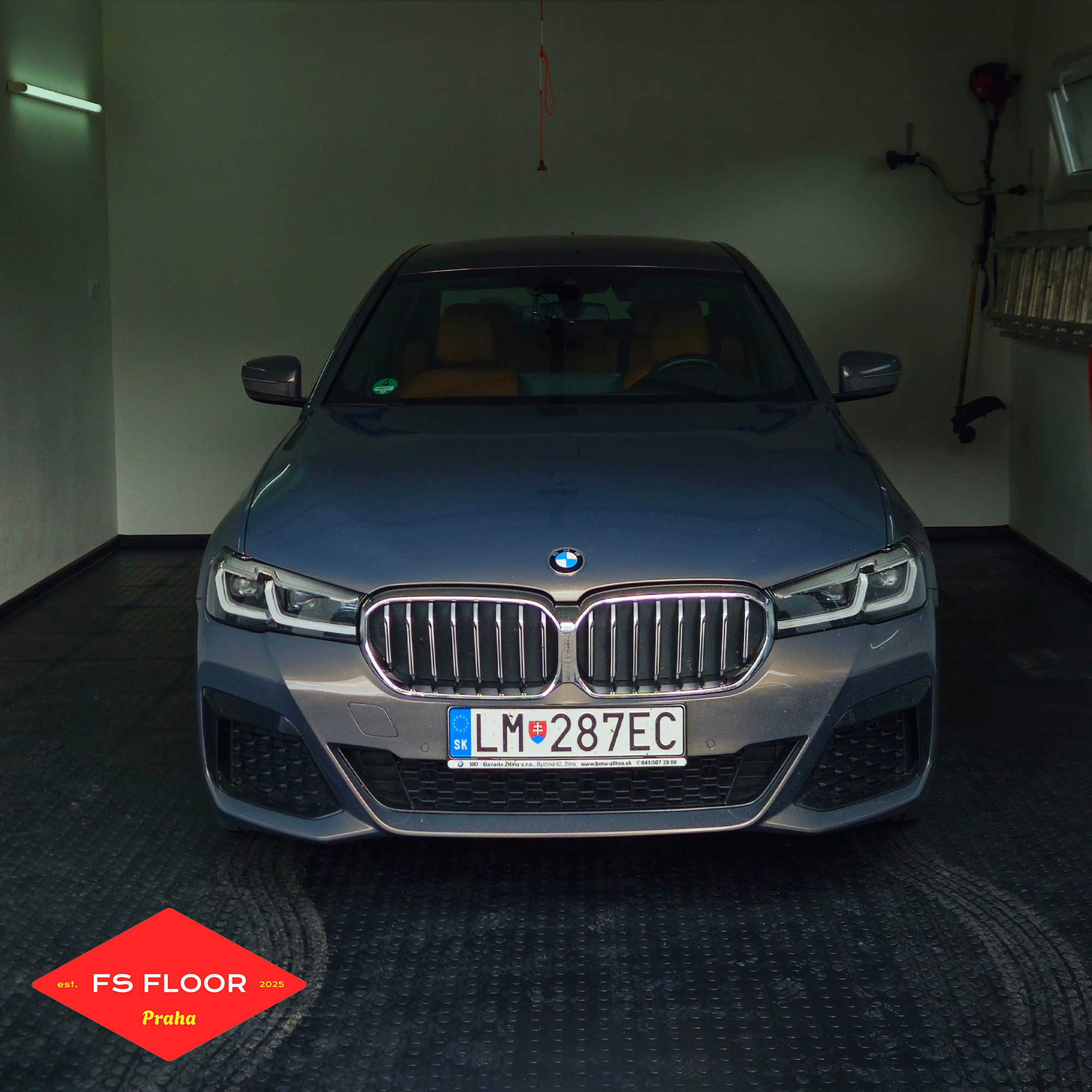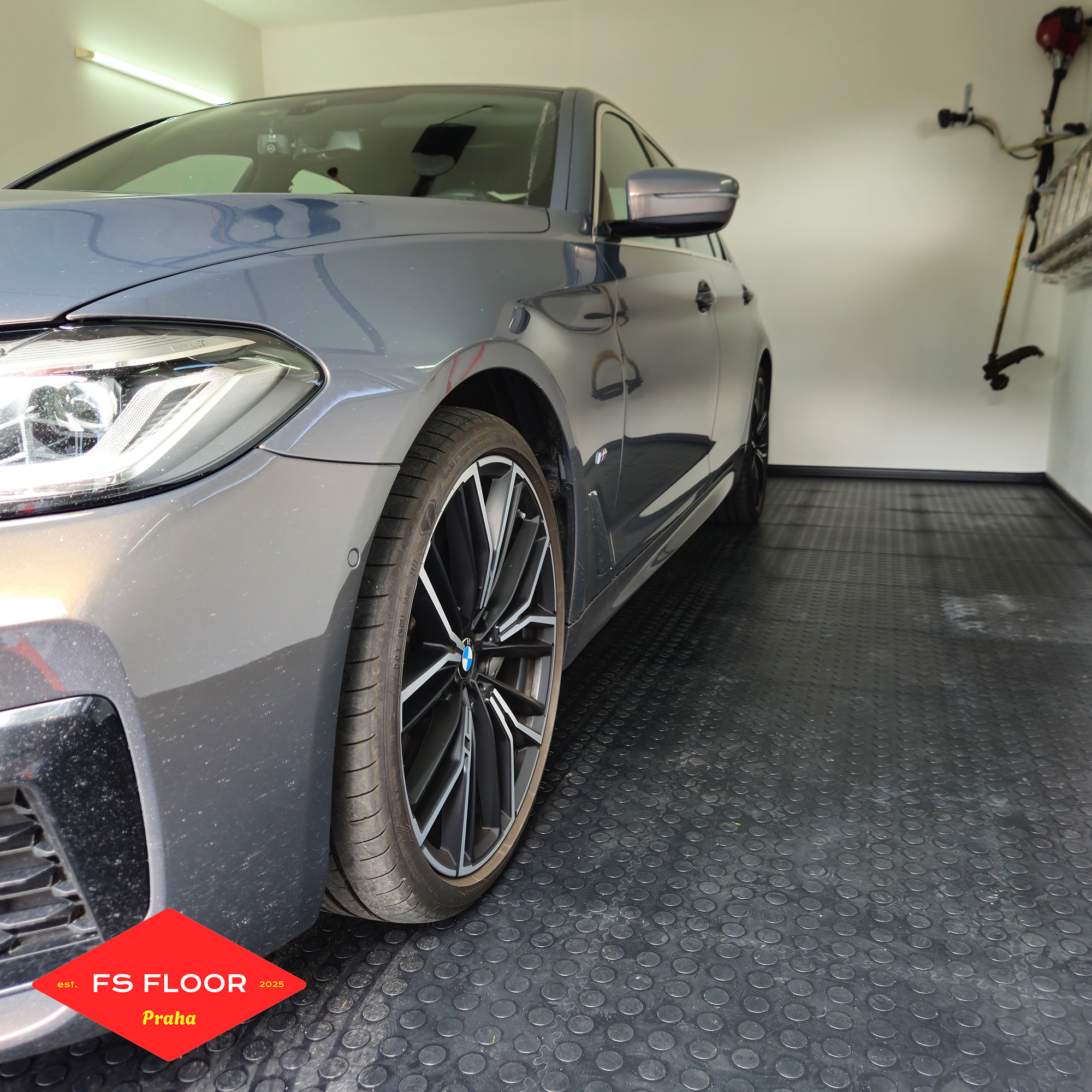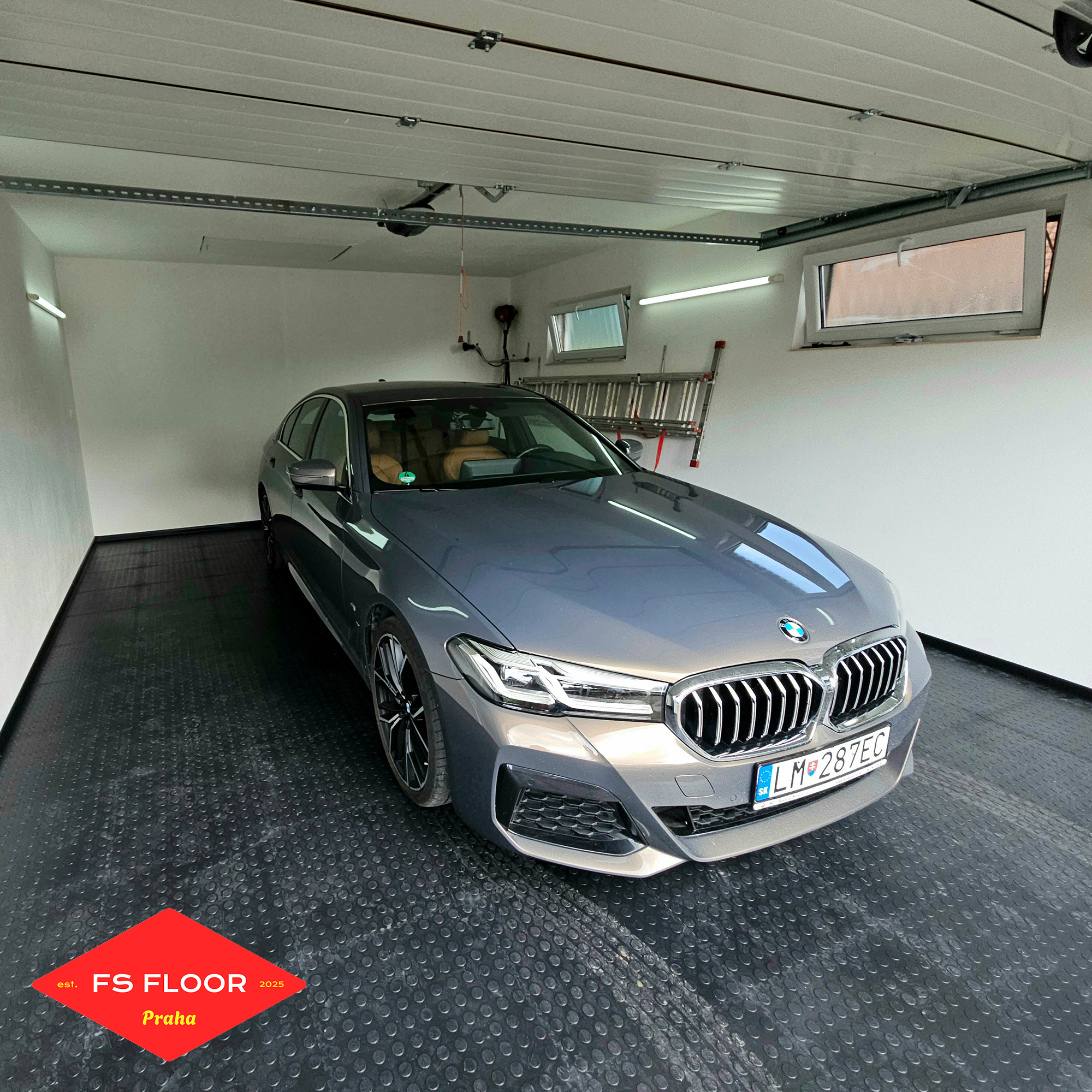 Rozloha prostoru: 40 m² Počet dlaždic: 160 Počet nájezdových ramp: 10 Trvání instalace/montáže: 3 hodiny Typ dlaždic: PVC plastová podlaha Fortelock Industry Barva: Black Povrch dlaždic: Mince